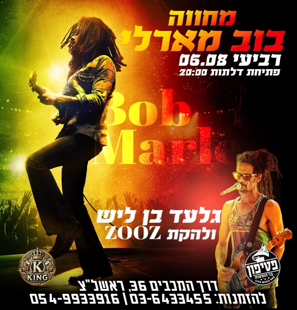 להקת ZOOZ – אחת מהרכבי הרגאיי האותנטיים והוותיקים בארץ – מזמינה אתכם למסע מוזיקלי מחבק, סוחף ומרקיד אל תוך הלב והנשמה של הגדול מכולם – Bob Marley.